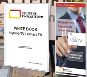 Die Deutsche TV-Plattform, ein Zusammenschluss privater- und öffentlich-rechtlicher Sender, verschiedener Industriesparten und Forschungsinstituten, unterstützt seit 2009 mit einer eigenen Arbeitsgruppe die Entwicklung des interaktiven Fernsehens. Sie engagiert sich auch für das standardisierte HbbTV (Hybrid broadcast broadband TV). So gibt es neben der gefragten Konsumenten-Broschüre „Hybrid-TV“ (3. Auflagen) und dem Flyer „Interaktives Fernsehen: HbbTV auf Smart-TV-Geräten“ (IFA 2012) auch seit 2011 das „White Book Hybrid-TV“. Die aktuelle 2. Ausgabe liegt neben Deutsch nun in englischer Fassung vor. Alle Dokumente sind abrufbar unter www.tv-plattform.de. (3/13)