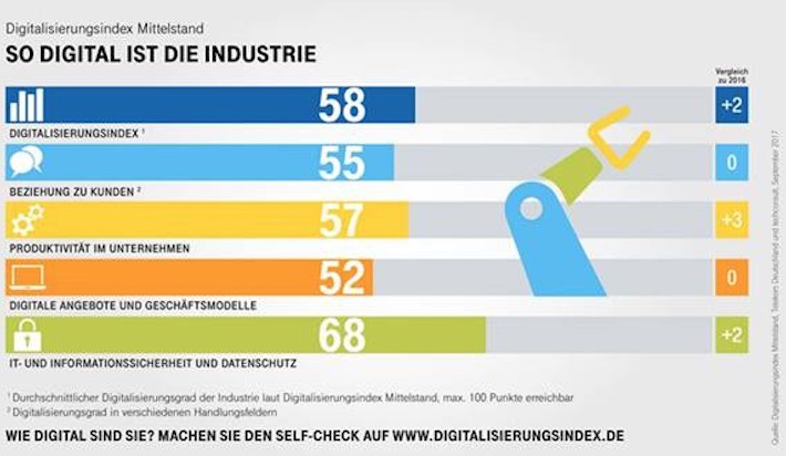 Mittelständische Industrieunternehmen haben laut Studie 2017 digital zugelegt. Im Digitalisierungsindex konnten sie sich im Vergleich zum Vorjahr nochmals um zwei Punkte auf jetzt 58 von 100 möglichen Punkten steigern. Damit gehören Industrieunternehmen im Branchenvergleich zu den digitalen Schrittmachern. Zum Vergleich: Über alle Branchen hinweg erreichen mittelständische Unternehmen im Digitalisierungsindex durchschnittlich 54 Punkte.