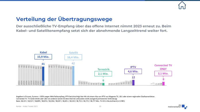 Betrachtet man die Terrestrik über alle Empfangswege, also stationär am klassischen Fernsehgerät und mobil über kleinere Empfangsgeräte am PC/Laptop oder mobile Geräte, so nutzen derzeit 15 Prozent aller Haushalte (5,9 Millionen) in Deutschland diesen Empfangsweg. Dabei setzt sich der langjährige Trend der zunehmenden mobilen Nutzung fort. 2023 werden 4,4 Millionen Haushalte und damit jeder zehnte Haushalt DVB-T2 HD auf mobilen Endgeräten nutzen. Die stationäre Nutzung am Fernsehgerät bleibt mit 2,1 Mio. Haushalten stabil.