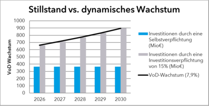 Besonders problematisch aus Sicht der Produktionsallianz: Eine gesetzliche Investitionsquote in Höhe von 15 Prozent der in Deutschland erwirtschafteten Umsätze würde aufgrund der Marktdynamik des Streamingsektors deutlich höhere Mittel generieren – bis zu 3,88 Milliarden Euro im betrachteten Zeitraum.