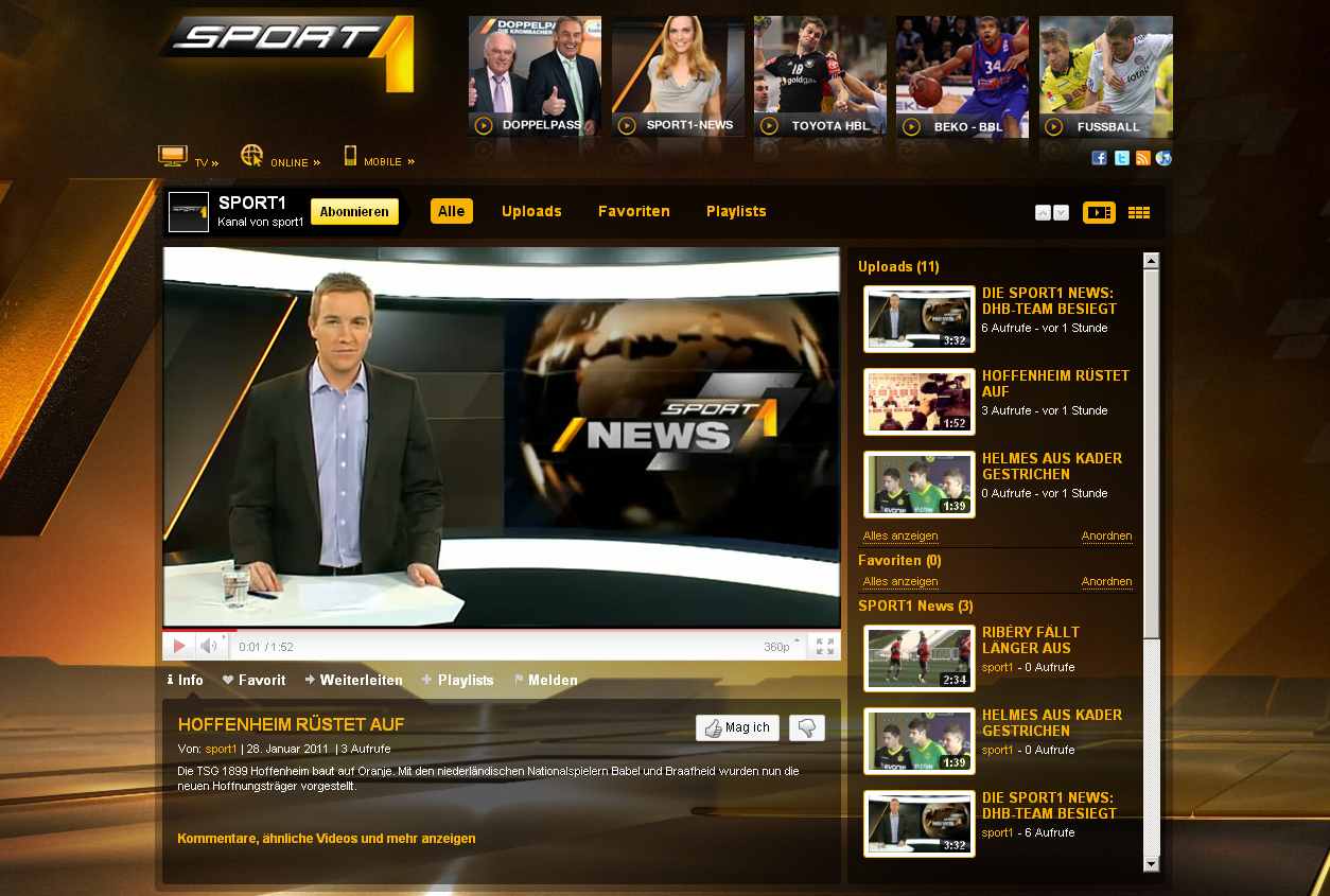SPORT1-Geschäftsführer Zeljko Karajica: „Mit dem SPORT1-Channel auf YouTube gehen wir in 2011 einen weiteren wichtigen Schritt bei der multimedialen Verbreitung unserer redaktionellen Sportberichterstattung. Ab sofort bleiben die User mit unserem Bewegtbild-Content auch auf dem größten Video-Portal im Web immer auf dem Laufenden.“ (02/11)