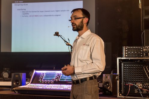 Rund 70 Gästen, unter ihnen Tontechniker, Verleiher und Anwender, nutzten die Gelegenheit, sich über die dLive-Mischpulte von Allen [&] Heath zu informieren. Ihnen wurden die Mischpulte vom englischen Senior Product Manager Nicola Beretta von Allen [&] Heath in einer zweistündigen Präsentation vorgestellt. Danach waren alle Gäste zu einem Hands-on eingeladen.