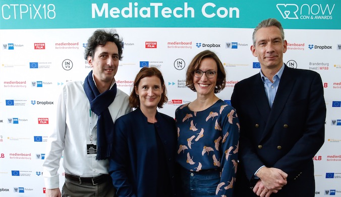 Den Startschuss zur MediaTech Con 2018 gaben Peter Effenberg, CEO transfermedia und Veranstalter der Changing the Picture Konferenz, Andrea Wickleder, Hub-Managerin des MediaTech Hub Potsdam und Veranstalterin der MediaTech Con, Dr. Anna Sarah Vielhaber, Leiterin New-Media-Förderung Medienboard Berlin-Brandenburg und Peter Lorenz, Geschäftsführer Virtual Reality Berlin Brandenburg e.V. und Veranstalter der VR Now Con [&] Award. (11/18)
