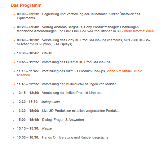Den Auftakt an den drei Veranstaltungstagen macht Sony und präsentiert sein aktuelles 3D-Line-up. Neben Sony Kameras auf 3D-Rigs wird das Unternehmen außerdem die 3D-Bildkorrektur mit seiner revolutionären 3D-Box MPE-200 sowie 3D-Regieanwendungen mit Mischern inkl. 3D-Option und das Monitoring mit 3D-Displays vorstellen. In einem Fachvortrag wird Andreas Berghaus, Produktmanager bei Sony, auf die Unterschiede und Besonderheiten bei 3D-Live-Produktionen aus dem Sport- und Eventbereich gegenüber 3D-Studioproduktionen eingehen. Fragestellungen wie „Welche Produktionen eignen sich überhaupt für 3D, und wo setzen Technik, Kosten und Aufwand mögliche Limits?“ sollen ebenso beantwortet werden wie konkrete Anwendungsfragen zu den Themen „Welche Hard- und Software ist für 3D-Live-Produktionen erforderlich?“ oder „Welche Herausforderungen bringt 3D für die Bildregie und die Schnittfolge mit sich?“.