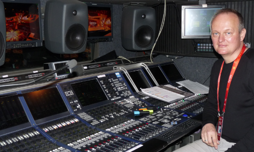 Der OB31 erstellt den finalen Fernsehmix, der aus den Moderationen, den berühmten Ländereinspielern, der Publikumsatmo, dem Musikmix aus den Ton-Ü-Wagen sowie vielen anderen Signalen besteht. An den Reglern eines weiteren Lawo mc²66-Pults sitzt hier Stefan Ebert (Foto).
