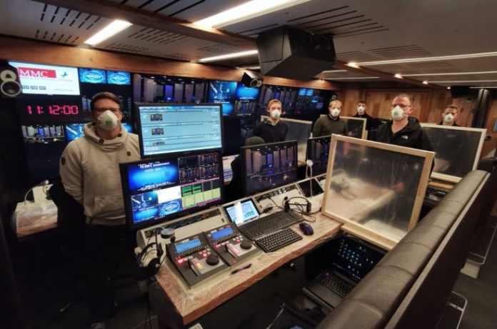 Auch die beteiligten Produktionsunternehmen mußten höchste Sicherheitsvorkerungen gewährleisten. Das betraf unter anderem auch TV Skyline. Der Mainzer Ü-Wagen-Dienstleister war mit seinem Ü8 bei der Produktion der dritten DSDS-Live-Show am Start. Alle Arbeitsplätze im Ü-Wagen waren mit speziell dafür angefertigten Plexiglasscheiben voneinander getrennt, Arbeitsflächen waren mit Folien abgeklebt und alle Crew-Mitglieder waren mit Schutzmasken unterwegs. Dazu wurden Arbeitsplätze und Arbeitsgeräte ständig desinfiziert. TV Skyline-Geschäftsführer Robert Kis erklärte dazu: „Tausend Dank an unser phantastisches Team vor Ort! Wie professionell ihr ALLE mit der Situation umgeht und mit sensationellem Einsatz immer wieder die Extrameile geht, damit die dritte DSDS Finalshow LIVE auf RTL in UHD stattfinden kann… Super stolz auf jeden Einzelnen!!!“ Er lobte auch die „tolle Zusammenarbeit“ mit den MMC Studios seit nunmehr drei Wochen.