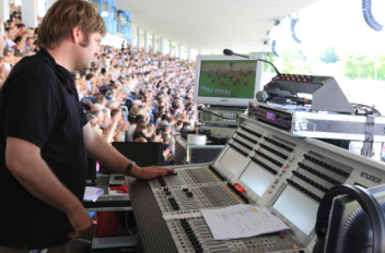 Insgesamt drei RockNet-Ringe waren im Olympiastadion auf der Pontaise im Einsatz. Diese sorgten für die Verteilung von 180 Audiosignalen zwischen vier verschiedenen Bühnen und dem FOH. Für die Installation zeichnete sich der Schweizer Veranstaltungsspezialist Skynight aus Genf verantwortlich. Die drei Ringe liefen im FOH an der digitalen Studer Vista 5 Konsole (Foto) zusammen, die für die Steuerung der RockNet-Interfaces verantwortlich war. Mit diesem Ansatz betrat Skynight Neuland, da bislang lediglich zwei RockNet Ringe über ein Studer-Mischpult verwaltet wurden.