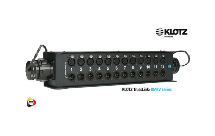 Das leichte und robuste Aluminiumgehäuse der DMXV TrussLink Stagebox ist schwarz pulverbeschichtet und mit abriebfester Lasergravur versehen. Sie beherbergt 8 oder 12 Kanäle sowie RMP Multipin-Anschlüsse nach MIL-C-5015 Standard. Die paarweise verschalteten Neutrik XLR 5p. Einbaubuchsen mit hartvergoldeten Kontakten sind als Input oder Output verwendbar. Mehr Flexibilität bietet die 12 Kanal Variante DMXV-04FM, die 8 Kanäle mit XLR 5p. und 4 Kanäle mit XLR 3p. Buchsen zur Verfügung stellt. Somit können zusätzlich zu den 8 DMX Kanälen per XLR 5p. auch 4 Kanäle für DMX per XLR 3p., AES/EBU oder auch analoge Mikrofon- und Line Audio Signale verwendet werden.