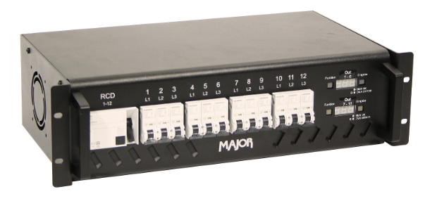 Das MAJOR Switch-Pack 12-Kanal ist als 19“/3HE Gerät für den Rack-Einbau bestimmt und mit zwei hochwertigen Relaiskarten bestückt. Hier lassen sich standardmäßig zwölf Schukodosen oder zwei Harting Han 16E Anschlüsse über den eingebauten DMX-Eingang steuern. Das Switch-Pack ist mit einem RCD-Schutzschalter sowie mit Einzelsicherungsautomaten abgesichert und wird mit einem montierten 32A CEE Steckverbinder geliefert. Alle Bedienelemente sind übersichtlich auf der Vorderseite angeordnet, die Lastabgänge sowie der DMX-Ein- und Ausgang befinden sich auf der Rückseite. Individuelle Lösungen sind auf Anfrage realisierbar.