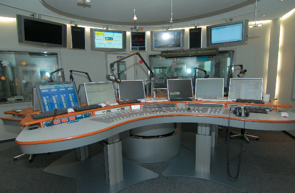 Der neuen Programmphilosophie folgend sollten im neuen Sendestudio 1 ganze On-Air-Teams auf Sendung gehen können. So richtete man neben einem DJ-Platz noch zwei Co-Moderatoreinheiten ein. An jeder Einheit ist Platz für zwei Co-Moderatoren mit eigenem Kopfhörermonitoring und Kreuzschienenanwahl etc. Zudem wurde auch noch ein Platz für bis zu drei Gäste zwischen den Co-Moderatorplätzen vorgesehen. Das physikalische Mainframe ist also im Studio 1 in drei Bedien-Units aufgeteilt (DJ plus zweimal Co-Moderatorplätze). Die Summen der beiden Co-Mod-Units sind dabei von der Signalführung auf Eingänge der DJ-Unit aufgeschaltet. Als Mikrofonprozessoren kommen die VIP von Thum+Mahr zum Einsatz. Die Sendeautomation und Planung ist von der Firma D.A.V.I.D.