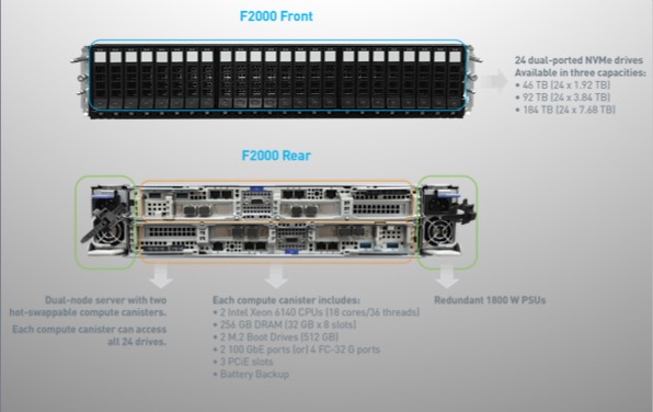 Das erste Produkt der F-Serie ist der Quantum F2000 Speicherserver, hochverfügbar und leistungsstark – speziell für NVMe entwickelt. Der F2000 Speicherserver ist ein 2HE 2-Node-Server mit zwei Hot-Swap-fähigen Recheneinheiten und bis zu 24 NVMe-Dual-Port-Laufwerken. Jede Recheneinheit kann auf alle 24 NVMe-Laufwerke zugreifen und verfügt über Rechenleistung, Speicher und Konnektivität, die speziell für höchste Leistung und Verfügbarkeit konzipiert wurde.