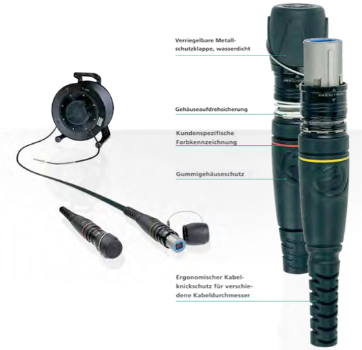 Das opticalCON-System ist nun noch robuster, unter anderem durch die speziell für Aussenanwendungen optimierte, verriegelbare und wasserdichte Metallschutzkappe und Gummischutzgehäuse. Der ergonomische Kabelknickschutz verbessert Kabelschutz und Wasserdichtigkeit im Langzeiteinsatz, und die Farbkennzeichnungsmöglichkeiten erlauben kundenspezifische Kodierung.