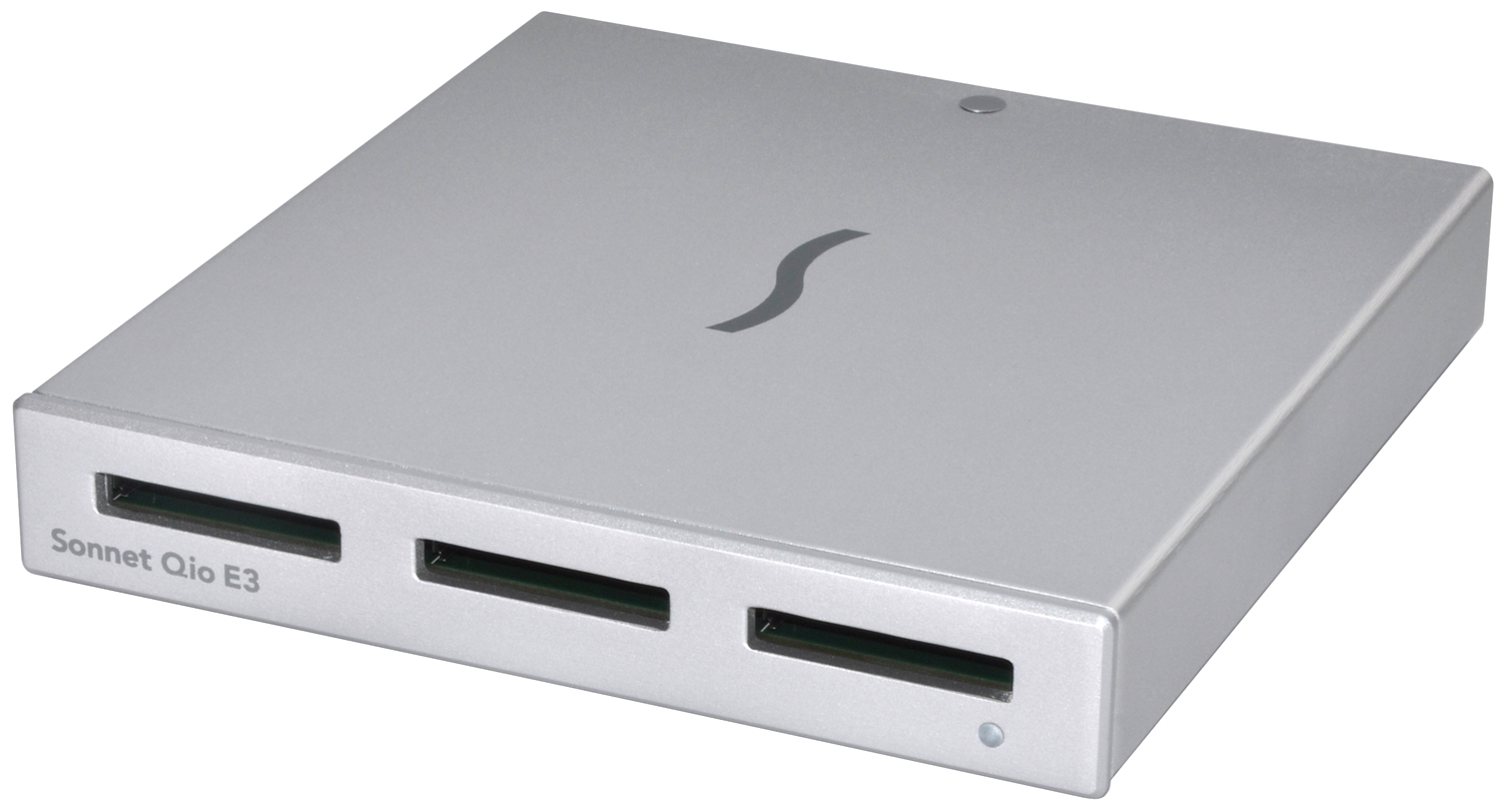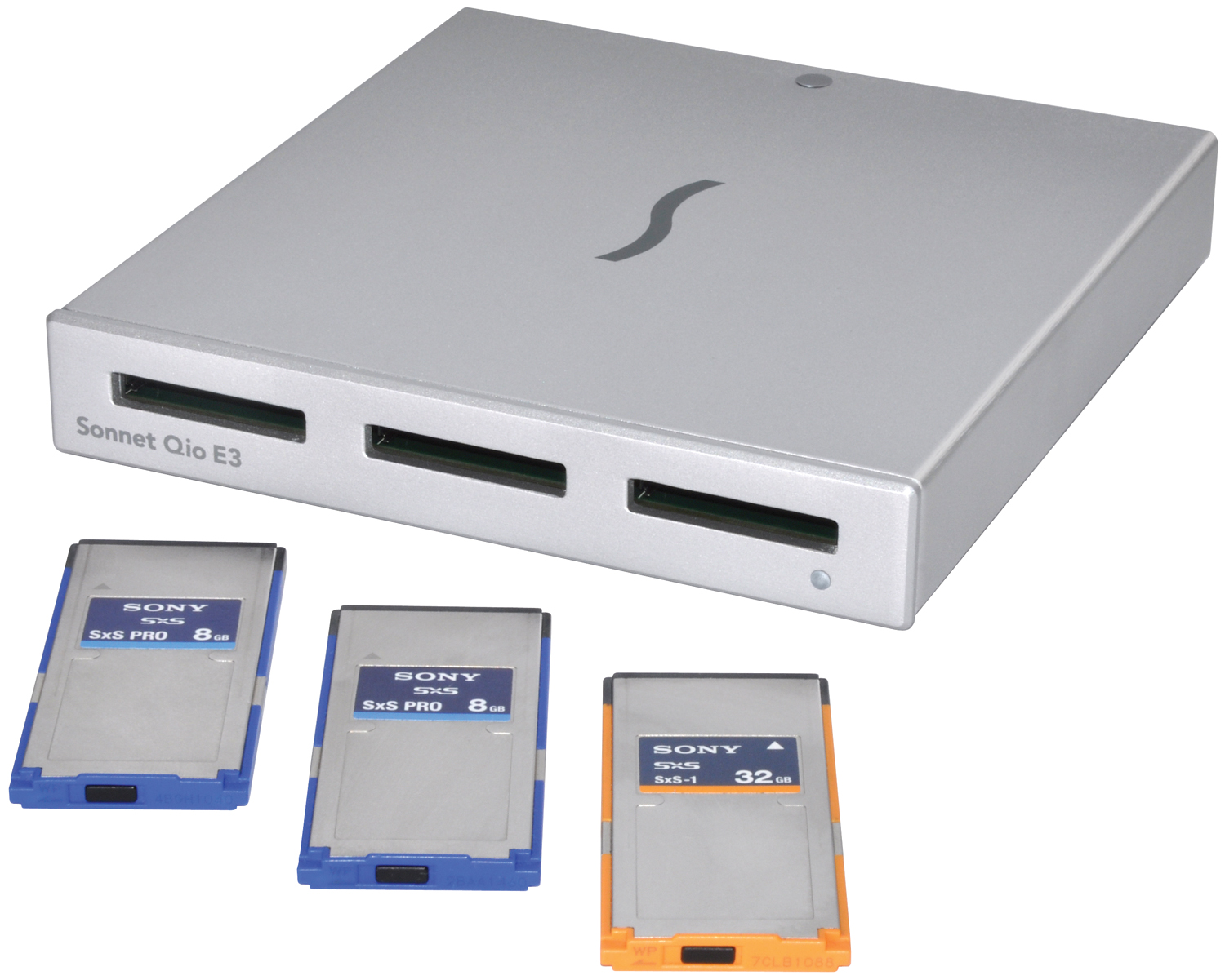 Für Videoprofis und Studios, die SxS-Karten einsetzen, ist Qio E3 eine kostengünstige Hochgeschwindigkeits-Alternative zu Stand-Alone-Kartenlesern. Das handliche Lesegerät verfügt über drei Einschübe für SxS-Karten. Über eine integrierte 2-Port 6 Gb/s eSATA-Schnittstelle kann es direkt an externe Speichersysteme angeschlossen werden und fungiert als Bus-Erweiterung für ExpressCard/34-Adapterkarten. Daten von drei SxS-Karten für Sony XDCAM EX HD-Camcorder lassen sich mit Qio E3 zeitgleich mit höchster Geschwindigkeit übertragen. Daten zwischen Karten, angeschlossenen Speichermedien und dem Computer können mit einer aggregierten Bandbreite bis maximal 400 MB/sec bei Desktop-Computern und bis zu 200 MB/sec bei Laptops übertragen werden. Qio E3 ist Mac OSX- und Windows-kompatibel und kann wahlweise mit PCIe 2.0 oder ExpressCard/34-Adapter angeschlossen werden.