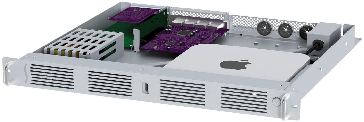 Mit dem Xmac mini Server (bisher RackMac mini Xserver) stellt Sonnet ein 1U-Rackmount PCIe 2.0 Erweiterungssystem mit zwei Thunderbolt-Anschlüssen vor. Ein Mac mini kann problemlos und sicher in dem stabilen Gehäuse installiert werden, welches durch das durchdachte Design zudem eine optimale Luftzirkulation gewährleistet. Der Xmac mini Server verfügt über zwei x16 (x4 mode) PCIe-Slots, ein Netzteil und eine Gigabit Ethernet-Karte. Das System ermöglicht den Anschluss von zwei PCIe 2.0-Adapterkarten (einer halblangen und einer in voller Länge). Über die Thunderbolt-Ports können weitere Thunderbolt-Geräte in Reihenschaltung angebunden werden.